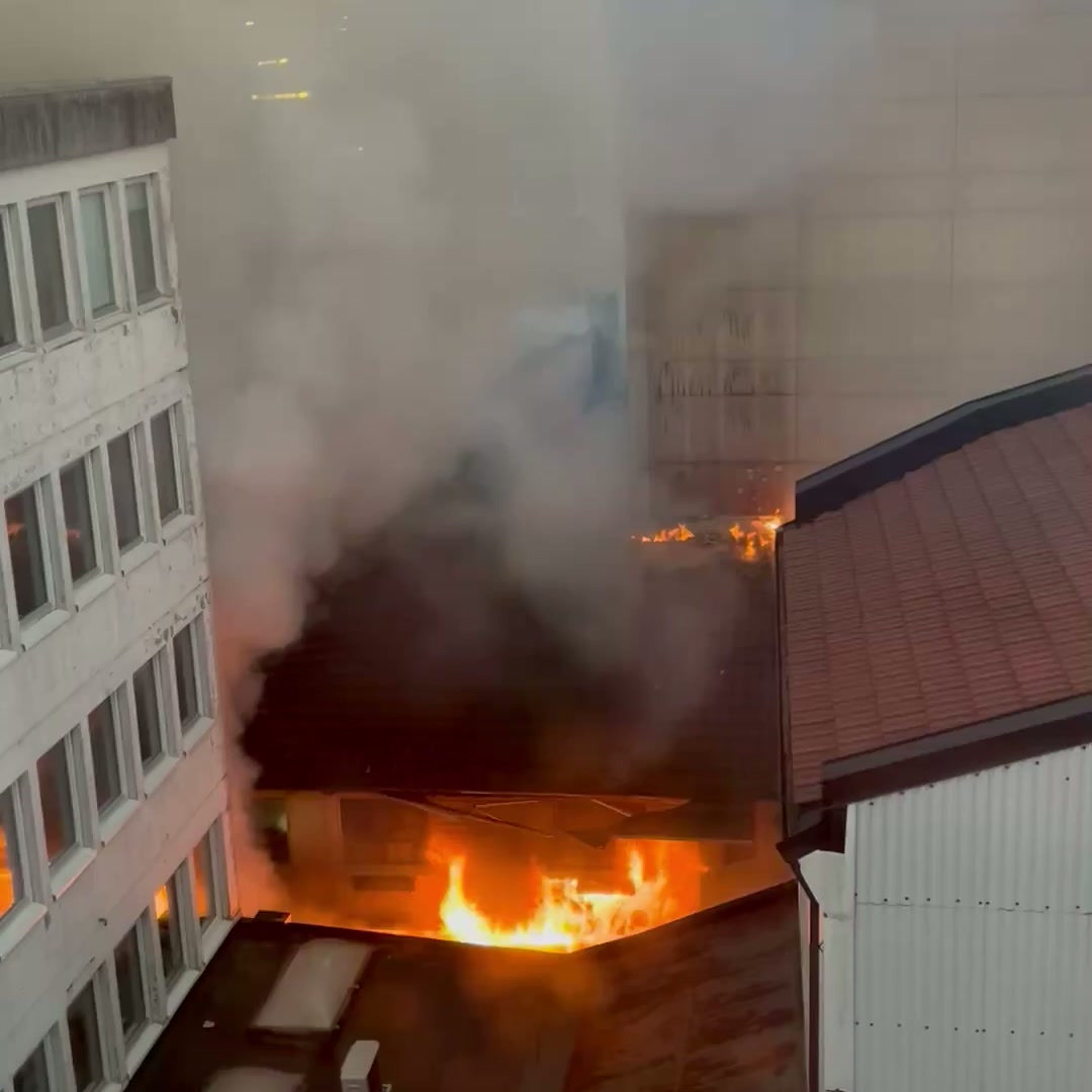 Etter kort tid hadde brannen spredd seg til andre etasje og loftet i trebygningen hvor det er leiligheter, og flammene slo opp fra taket.