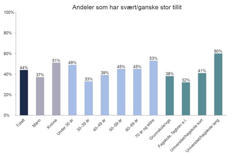 Det er ellers, som i tidligere undersøkelser, markert forskjell på kvinner og menn, slik at kvinner gjennomgående stoler mer på myndighetene enn menn.
