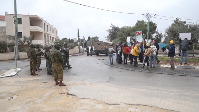 Foto: Ghassan Bannoura / Combatants for PeaceDenne gongen, som dei fleste gongar, blir dei tvinga til å avslutte demonstrasjonane. Med tungt væpna militært personell får dei beskjed om at dei ikkje får lov å stogge opp medan dei forlèt rundkøyringa.