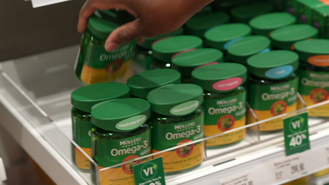 Siden apoteket ikke har det spesifikke merket, plukker de i stedet med seg tre flasker flytende tran og et par bokser med kapsler.