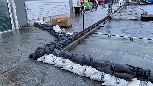 Stavanger kommune har lagt ut sandsekker i Vågen i Stavanger for å hindre at vannet flommer over kaikanten.