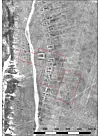 De røde firkantene er områdene som er undersøkt i denne studien. Her kan du se rekker med firkantede jordvoller som sprer seg ut fra en sentral, større firkant. (Illustrasjon: Radivojevic et al/Antiquity 2025)