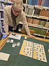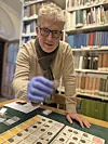 Svein H. Gullbekk ser på et brett med dirhemer. (Foto: Lasse Biørnstad/forskning.no)
