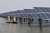 Employees row a boat as they examine solar panel boards at a pond in Lianyungang, Jiangsu Province, China, March 16, 2016. REUTERS/Stringer ATTENTION EDITORS - THIS PICTURE WAS PROVIDED BY A THIRD PARTY. THIS PICTURE IS DISTRIBUTED EXACTLY AS RECEIVED BY REUTERS, AS A SERVICE TO CLIENTS. CHINA OUT. NO COMMERCIAL OR EDITORIAL SALES IN CHINA. CHINA STRINGER NETWORK