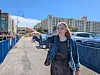 Victoria Hofmo viser frem Sunset Park - et havneområde i Brooklyn i New York hvor det vrimlet av nordmenn. I bakgrunnen ser du Brooklyn Army Terminal. (Foto: Anders Moen Kaste)