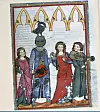 Ridderen danser med to skjønne kvinner, mens spillemannen leder dansen. Den populære ridderen dyrker både krigen, dansen og kjærligheten. (Bilde fra Codex Manesse, Universitetsbiblioteket i Heidelberg)