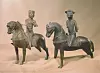 Han har krone på hodet og spiller på en fidel (forløperen til fele), og hun virker såre fornøyd der hun sitter med en reisehatt på hodet. Det lykkelige figurparet til hest er typisk for tiden rundt år 1300. De ble funnet på Jylland. Men funnstedet er blitt tolket som at de to figurene kanskje var på vei fra et verksted i Hamburg til Oslo. (Foto: Nationalmuseet, København)