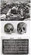 Øverst: Tar du en tur til ruinene etter Mariakirken i Gamlebyen i Oslo, kan du fortsatt se spor etter gravkammeret til Eufemia og Håkon 5. Midten: Hodeskallene til Eufemia og Håkon. Nederst: Det nye skrinet hvor de to nå ligger, i kongekrypten på Akershus slott og festning. (Alle foto: Riksantikvaren)