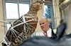 I en skuff ved veggen har Bjerke en samling med øyne i ulike former og farger. Her demonstrerer han det stirrende blikket til en Hubro.