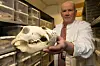 Hodeskallen til en brunbjørn. Skallene blir bevart i rekker av plastkasser. Alt blir registeret og katalogisert. For tiden lages også tredimensjonale avstøpninger av alle skaller. (Foto: Yngve Vogt)