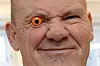 I en skuff ved veggen har Bjerke en samling med øyne i ulike former og farger. Her demonstrerer han det stirrende blikket til en Hubro. (Foto: Yngve Vogt)