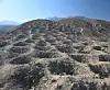 En lang linje av like store hull bukter seg over en åsrygg i Peru.