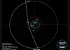 Her går 3I/ATLAS gjennom solsystemet. Dette er omtrent der den er rundt 20.11. Den gule, ytterste banen er planeten Jupiter. (Illustrasjon: Catalina Sky Survey/NASA)