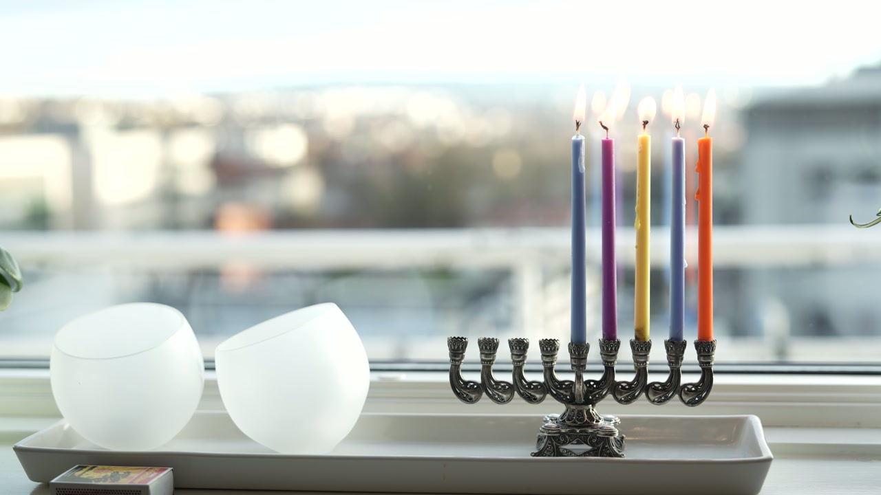 Hanukka-lysestaken står i vindaugskarmen heime hos «Anna». Kvar kveld i høgtida tenner ho ljos og les ei velsigning.