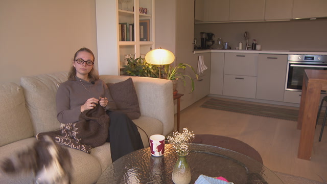 Pernille Sletteberg Sørensen (25) smiler når hunden Ludvig logrende hopper oppi sofaen.