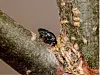 Bilde 2: Liten almesplintborer (Scolytus laevis) i ferd med å gjøre næringsgnag i grenvinkler til friske almetrær. (Foto: I. Børja)