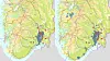 Bilde 4: Utbredelse av almesyke i Norge over tid: Før 2020 (fra 1963-2019) var sykdommen hovedsakelig begrenset til Oslofjord området (venstre). I perioden 2020-2024 ble sykdommen påvist både på Vestlandet og Sørlandet (høyre). (Kilde: Skogskader.no / Kartverket / NIBIO)