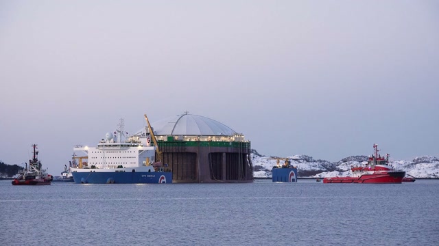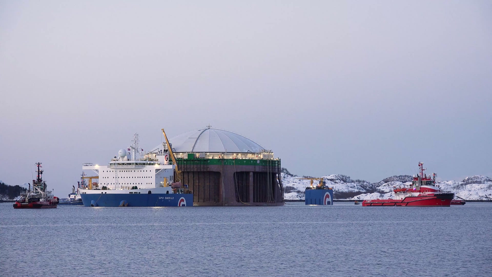 Fire svære taubåter holder «Storbåtsegget» på plass.