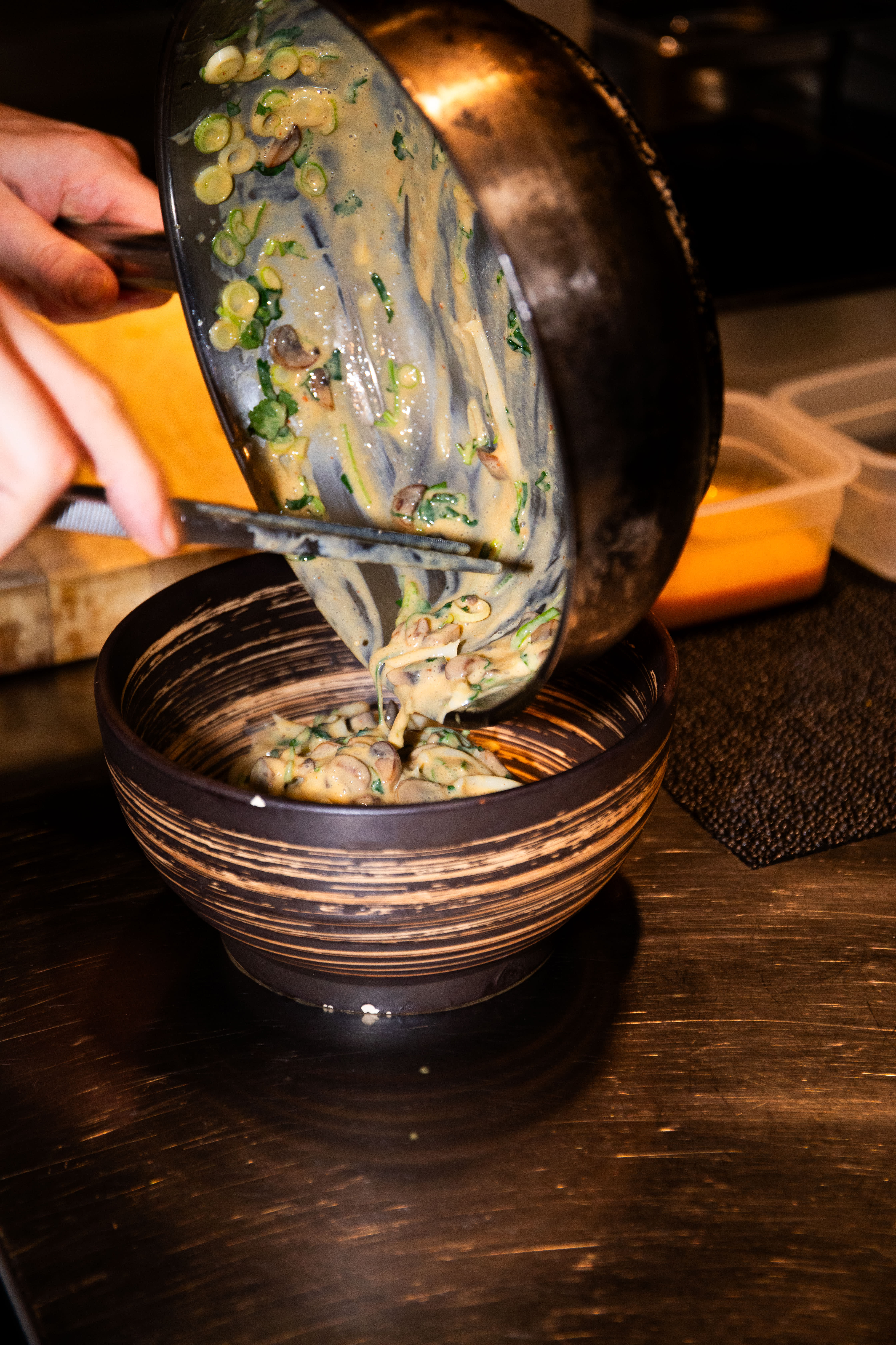 Her er retten. Slurpete saus av egg, parmesan og kimchisaus. Den er tilsatt sopp og toppet med vårløk og kimchisesam.