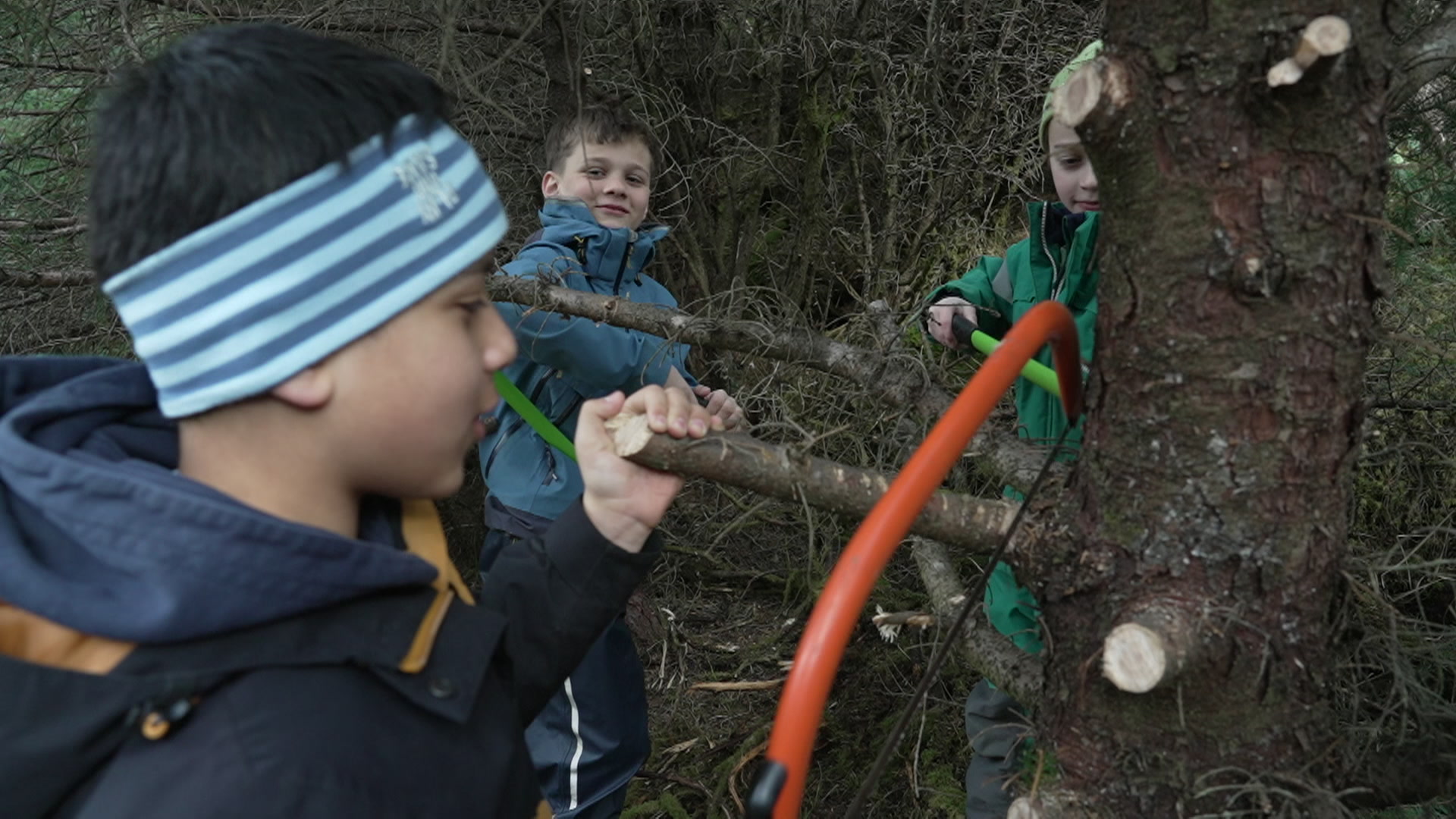 FOTO: Nils Ole Refvik / NRKNo hjelper dei til slik at arbeidet blir lettare for dei vaksne eldsjelene som fjernar trea på dugnad.
