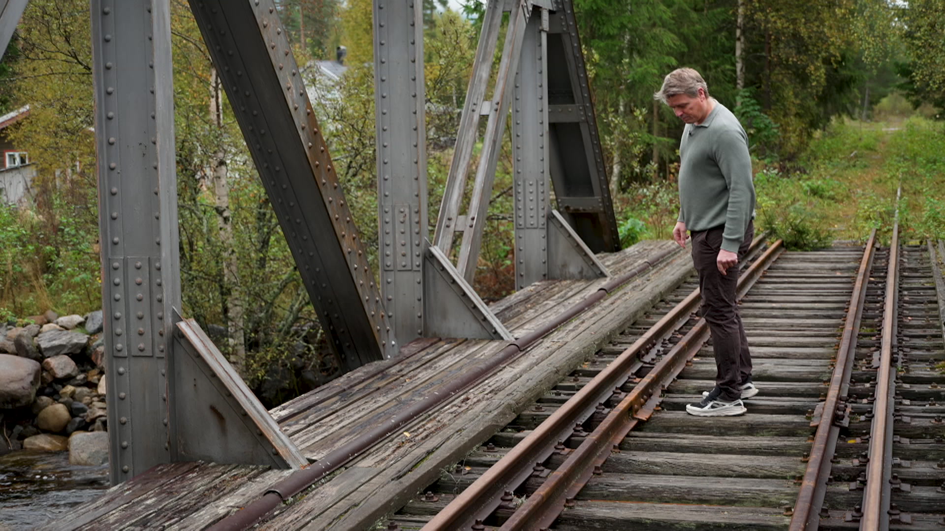 Ordføreren drister seg ut på den råtnende jernbanebrua.