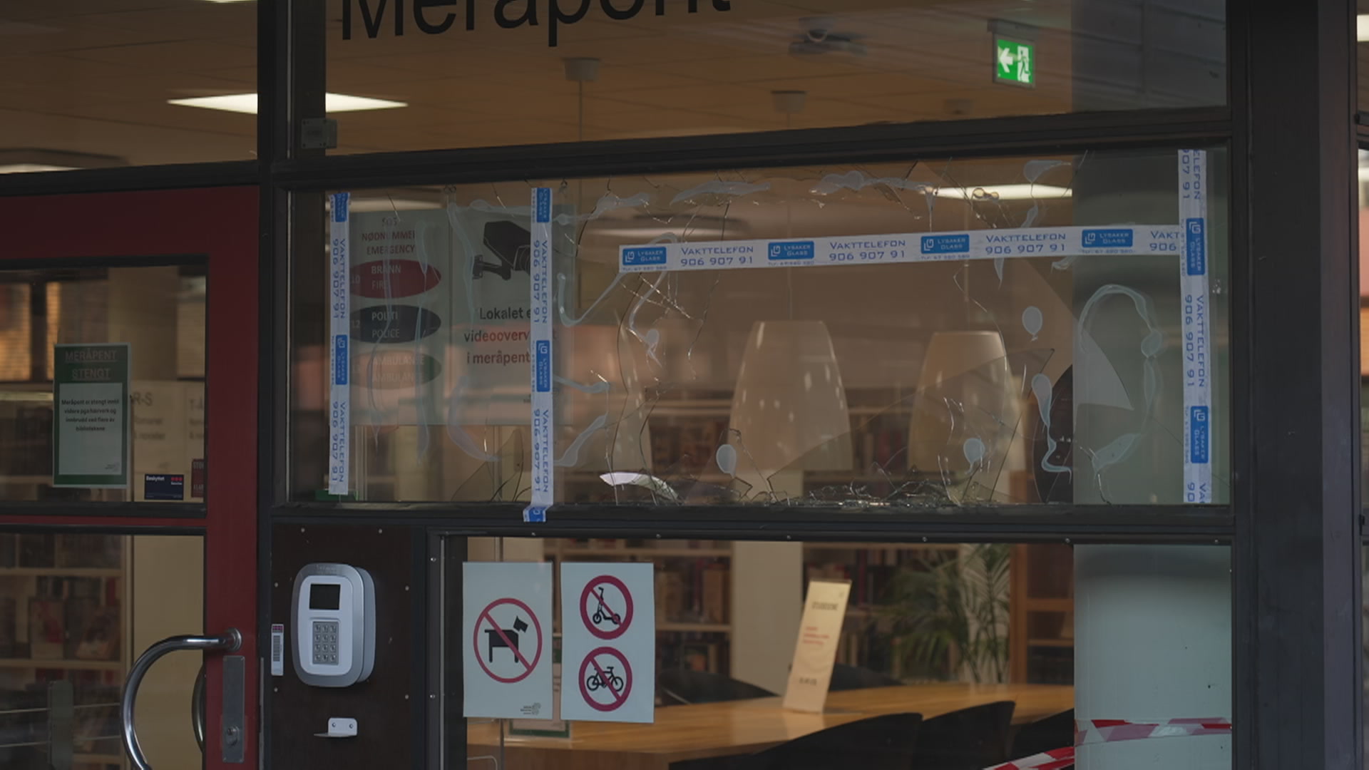 På biblioteket på Bekkestua er ruta blitt knust med en stein.