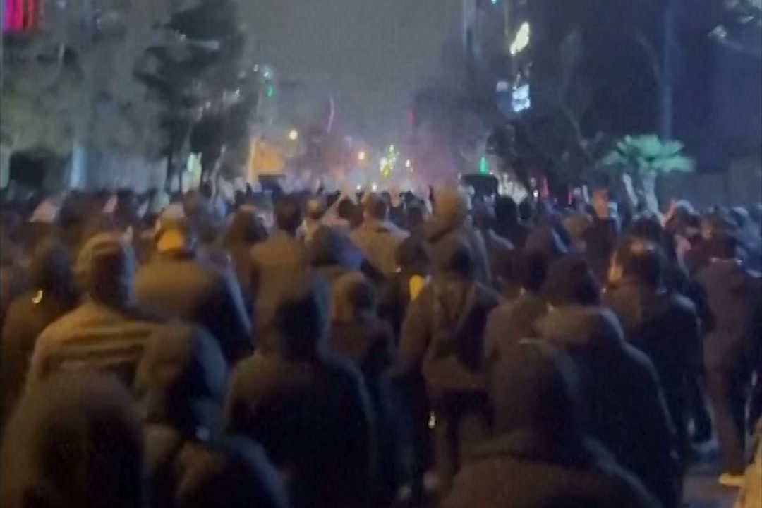 Denne videoen skal vise demonstranter i hovedstaden Teheran i Iran. Videoen ble mottatt lørdag 10.januar og er verifisert av nyhetsnyrået AP.