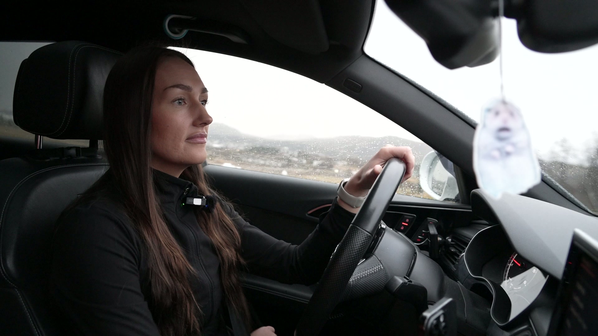 I bilen har ho müslibar og riskjeks til dei dagane dei ikkje når tunnelen sine opningstider og kan bli ståande i fleire timar.