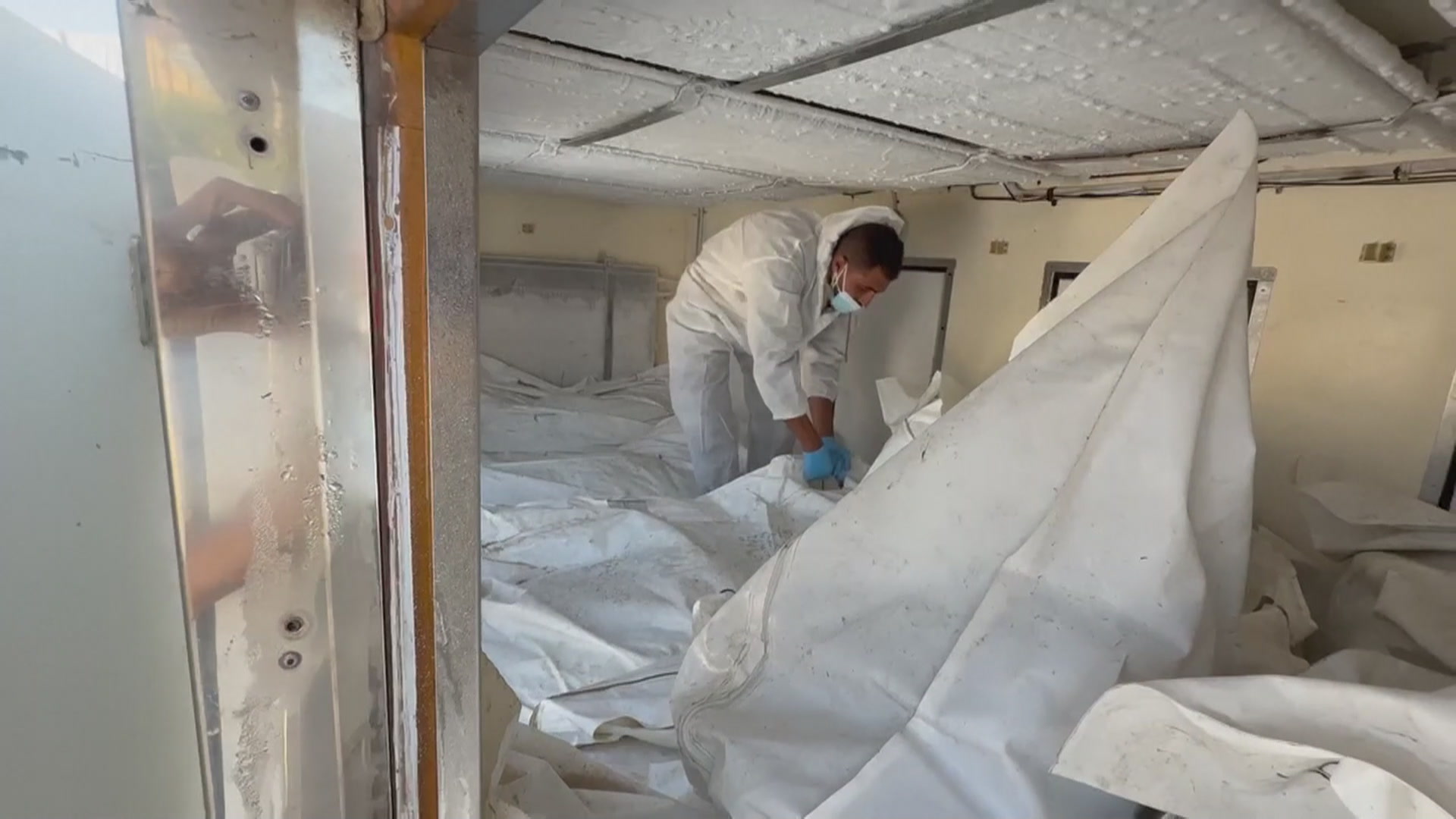I hvite likposer ligger de døde i høye stabler i frysebiler. De bæres ut og legges på rad og rekke, før de skal gravlegges i en massegrav.